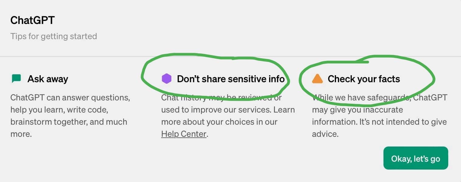 ChatGPT is aware of its limitations and follows the age-old Internet custom of placing the onus of safety entirely on the user. Don't share sensitive info (we'll just copy it, and who knows where it'll wind up?), check your facts (because we never will!).