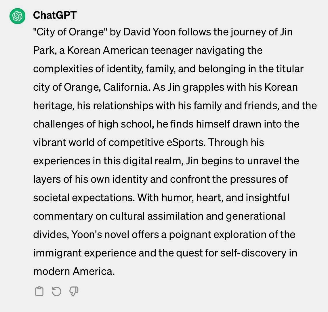ChatGPT is so wrong it's funny. I've never written about a Jin Park, Orange, CA, or eSports. The other parts (immigrant experience, self-discovery) are pretty good...for my first, *entirely different* novel, Frankly In Love. I guess my next step would be to fine-tune my prompt til I get the result I want? How long will that take? Longer than writing a summary myself? (Yes.)